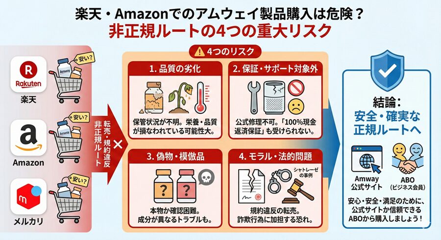 正規ルート以外でアムウェイ製品を購入するのは、価格によっては一見お得に思えるかもしれませんが、リスクが高いです。