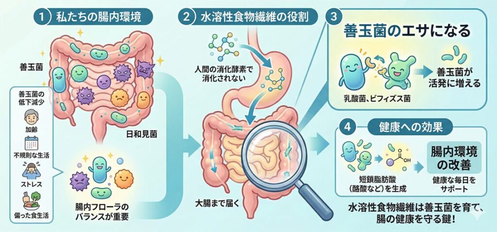 つまり、水溶性食物繊維を摂ることは、自分のお腹の中にいる善玉菌を応援し、増やすための直接的なサポートになるのです。