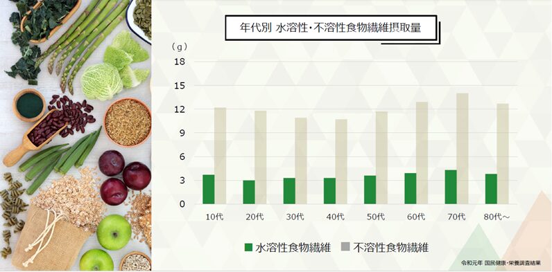 厚生労働省の「日本人の食事摂取基準」などでも食物繊維の積極的な摂取が推奨されていますが、実際のデータを見ると、10代から80代以上のすべての世代において、理想的な摂取量には届いていないのが現状です。特に深刻なのが「水溶性食物繊維」の不足です。