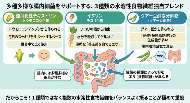 腸内には多種多様な細菌が棲んでおり、細菌の種類によって好むエサ(食物繊維)が異なります。だからこそ、1種類ではなく、複数の水溶性食物繊維をバランスよく摂ることが極めて重要なのです。