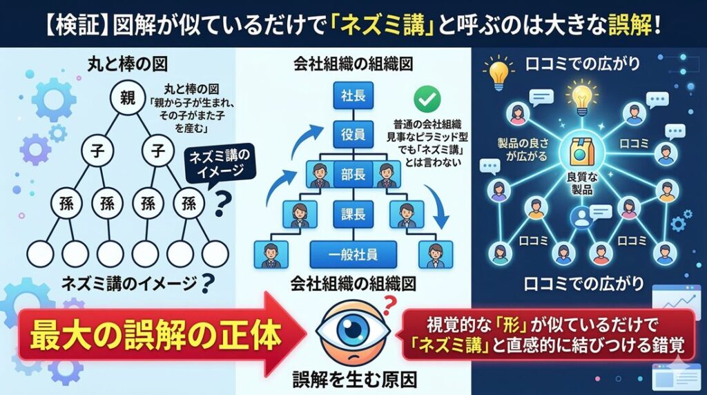 口コミで製品の流通が広がっていくネットワーク図を書くと、どうしても上から下へ広がる形になります。この「視覚的な図の形」が似ているというだけで、「ネズミ講だ」と直感的に結びつけてしまう錯覚こそが、最大の誤解を生む原因なのです。