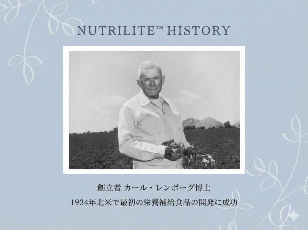この直感こそが、現代で注目される「ファイトケミカルス(植物由来成分)」研究の原点となりました 。1934年、彼は北米で初めてのマルチビタミン・ミネラルサプリメントを発売し、ニュートリライトの歴史が幕を開けました 。