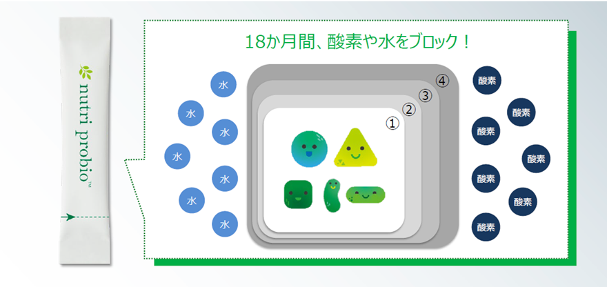 デリケートな生きた菌は、酸素や水分に触れると死滅してしまいます。ニュートリ プロバイオのパッケージのスティックは、特別な「4層構造フィルム」を採用しており、製造から賞味期限までの18ヶ月間という長期間にわたって、善玉菌を酸素や水分から確実に守り抜きます。